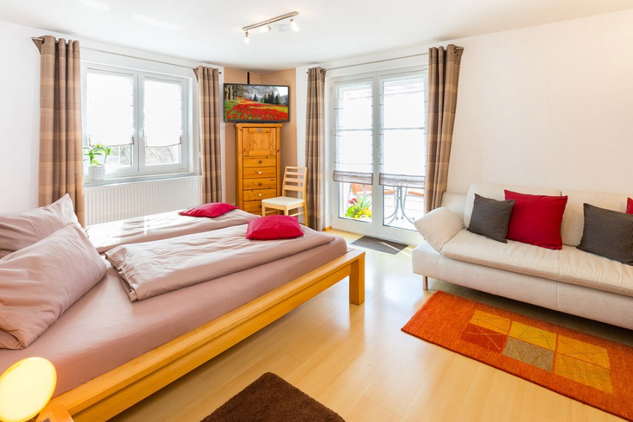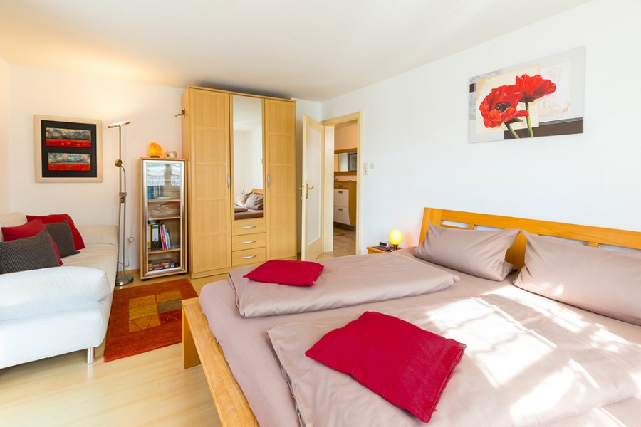 2-Zimmer-Wohnung: 1 Wohnraum und 1 Schlafraum Etage: Obergeschoss Unterkunft mit Balkon BD/DU/WC Küche: Kochnische Schlafzimmer Wohnzimmer Nichtraucher-Zimmer Bettwäsche Doppelbett Fernseher im Zimmer Geschirrhandtücher Handtücher