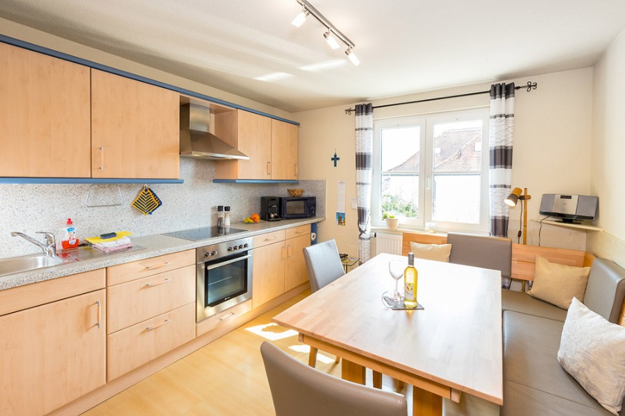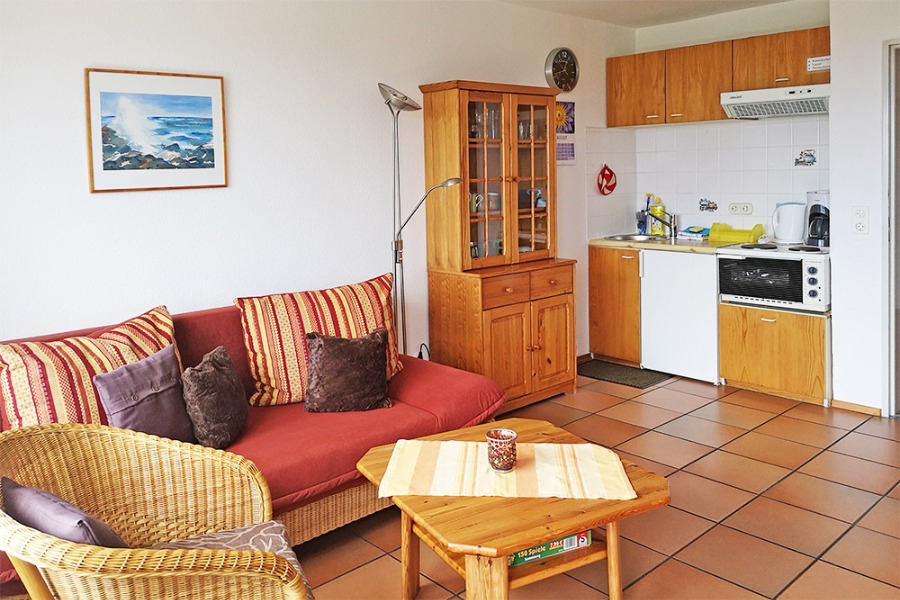 2-Zimmer-Wohnung: 1 Wohnraum und 1 Schlafraum Etage: Obergeschoss Unterkunft mit Balkon BD/DU/WC Esszimmer Wohnküche Wohnschlafzimmer Kinderbett Kinderhochstuhl Nichtraucher-Zimmer Bettwäsche Doppelbett Fernseher im Zimmer Geschirrhandtücher Geschirrspülmaschine Handtücher Internet Kühlschrank mit Gefrierfach Mikrowelle