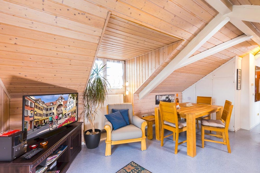 2-Zimmer-Wohnung: 1 Wohnraum und 1 Schlafraum Etage: Dachgeschoss Unterkunft mit Balkon BD/DU/WC Wohn- und Esszimmer mit Küche Kinderbett Kinderhochstuhl Nichtraucher-Zimmer Bettwäsche Doppelbett Fernseher im Zimmer Geschirrhandtücher Handtücher Internet Kühlschrank mit Gefrierfach
